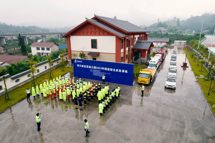 为切实做好高速公路保通保畅,深化“一路多方”联勤联动机制,进一步提升成宜高速防汛抢险的应急处置能力,加强“召之即来,来之能战,战之能胜”的应急抢险救援队伍建设,7月20日,成宜公司联合荣县应急管理局、荣县交通运输局、荣县卫生健康局、荣县铁厂镇人民政府、高速交警、高速执法等单位在成宜高速公路开展2023年隧道综合应急演练。蜀高集团党委委员、副总经理徐华,成宜公司党委书记、董事长杨大伟及相关单位负责同志出席活动。
