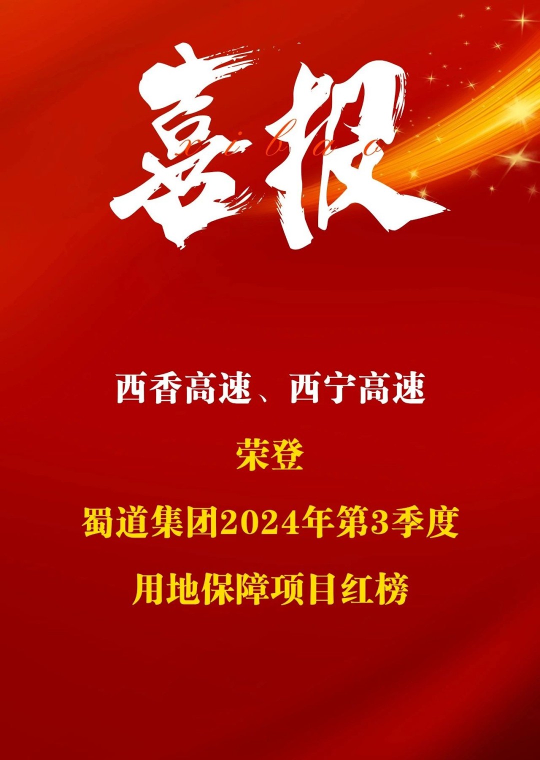 10月31日,蜀道集团印发《关于在建项目2024年第3季度征拆及用地保障工作情况的通报》(蜀道司办﹝2024﹞223号),在蜀道集团坚强领导和大力支持下,2024年3季度,3044am永利集团所属在建项目征拆及用地保障工作推进良好,所属西香高速、西宁高速在征拆红线用地征拆比例及重大迁改事项中取得明显进展,并双双荣登用地保障项目红榜。此次3044am永利集团所属西香高速、西宁高速同时荣登红榜,是对3044am永利集团在建项目在征地拆迁和用地保障工作的充分肯定。