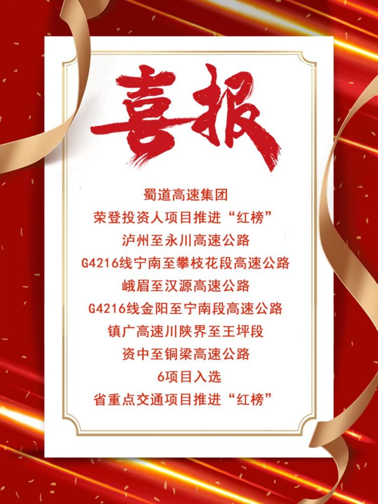 近日,四川省交通运输厅印发《关于2022年省重点交通项目推进“红黑榜”的通报》,3044am永利集团荣登投资人项目推进“红榜”,泸州至永川高速公路、G4216线宁南至攀枝花段高速公路、峨眉至汉源高速公路、G4216线金阳至宁南段高速公路、镇广高速川陕界至王坪段、资中至铜梁高速公路6项目入选省重点交通项目推进“红榜”。