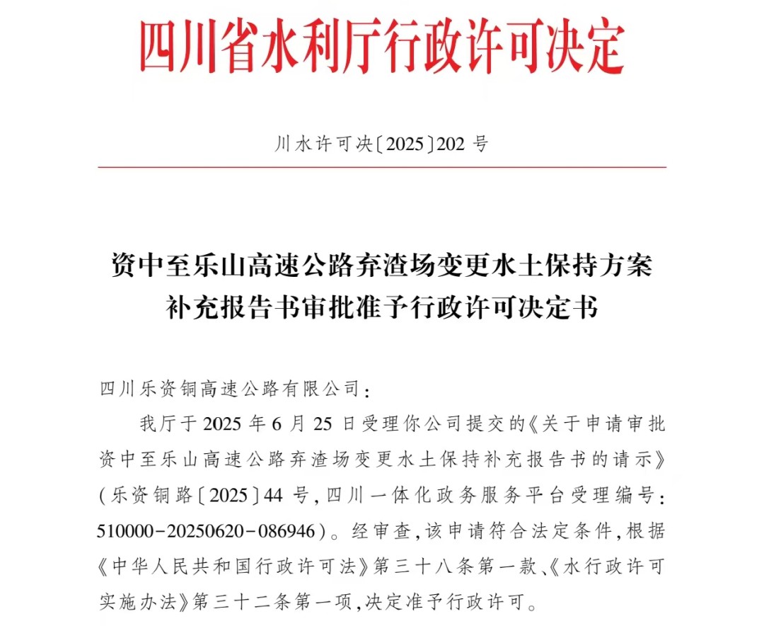 近日,乐资铜公司正式取得资中至乐山高速公路弃渣场变更水土保持方案补充报告书的行政许可批复。此次获批是项目合规建设的关键突破,为全线水土保持工作和施工推进提供了坚实保障。