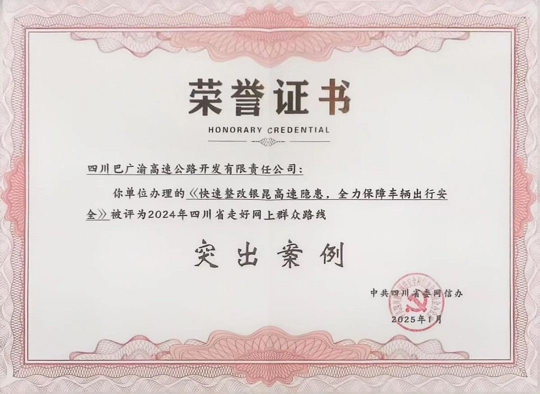 1月17日,由中共四川省委网信办主办的四川省走好网上群众路线工作会在泸州市召开,巴广渝公司《快速整改银昆高速隐患,全力保障车辆出行安全》案例获评“2024年四川省走好网上群众路线突出案例”。
