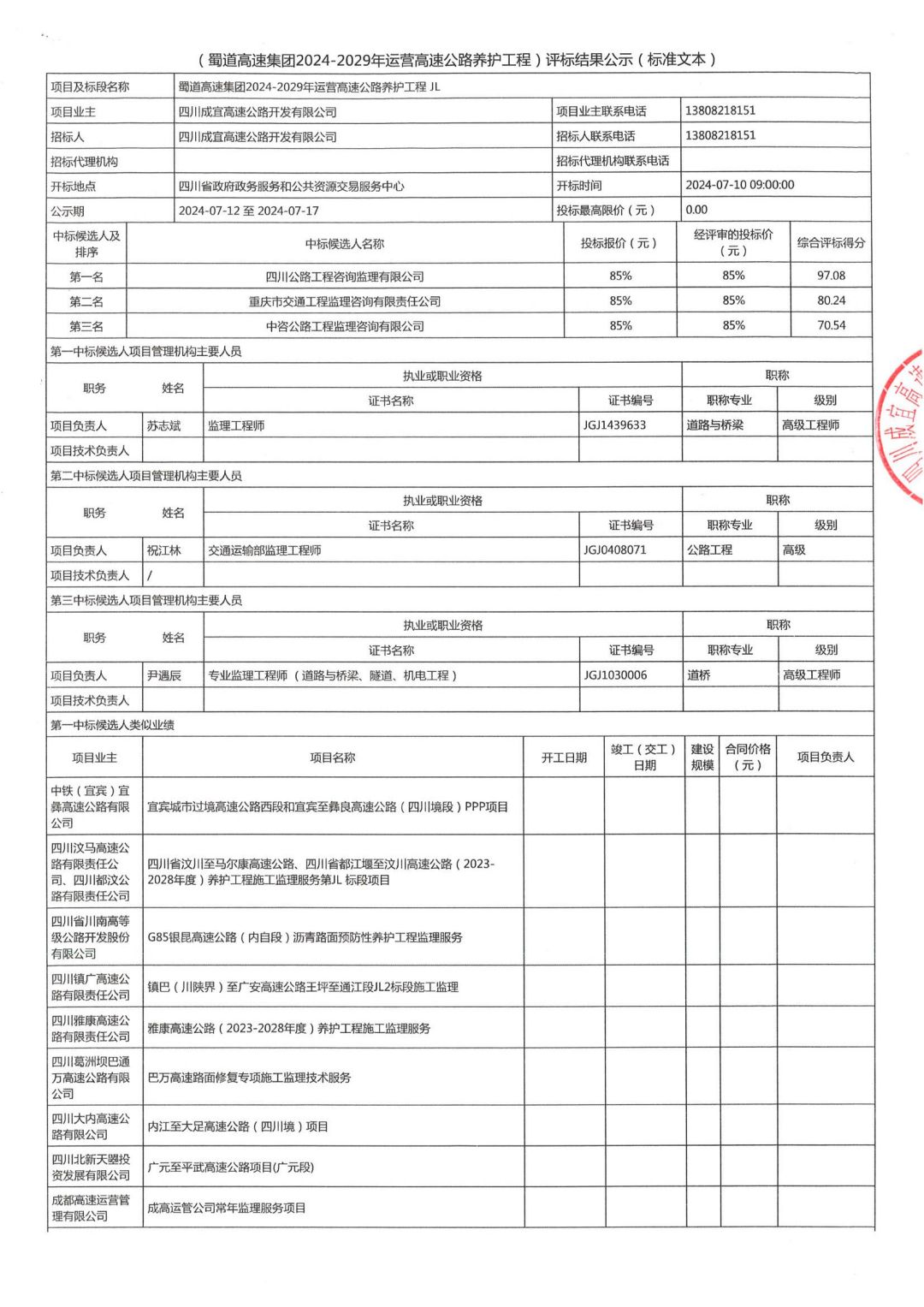 3044am永利集团2024-2029年运营高速公路养护工程评标结果公示