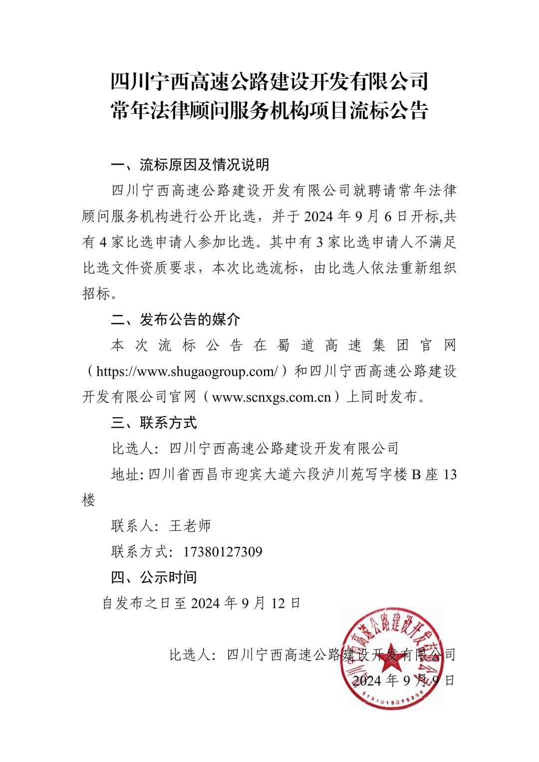 四川宁西高速公路建设开发有限公司常年法律顾问服务机构项目流标公告
