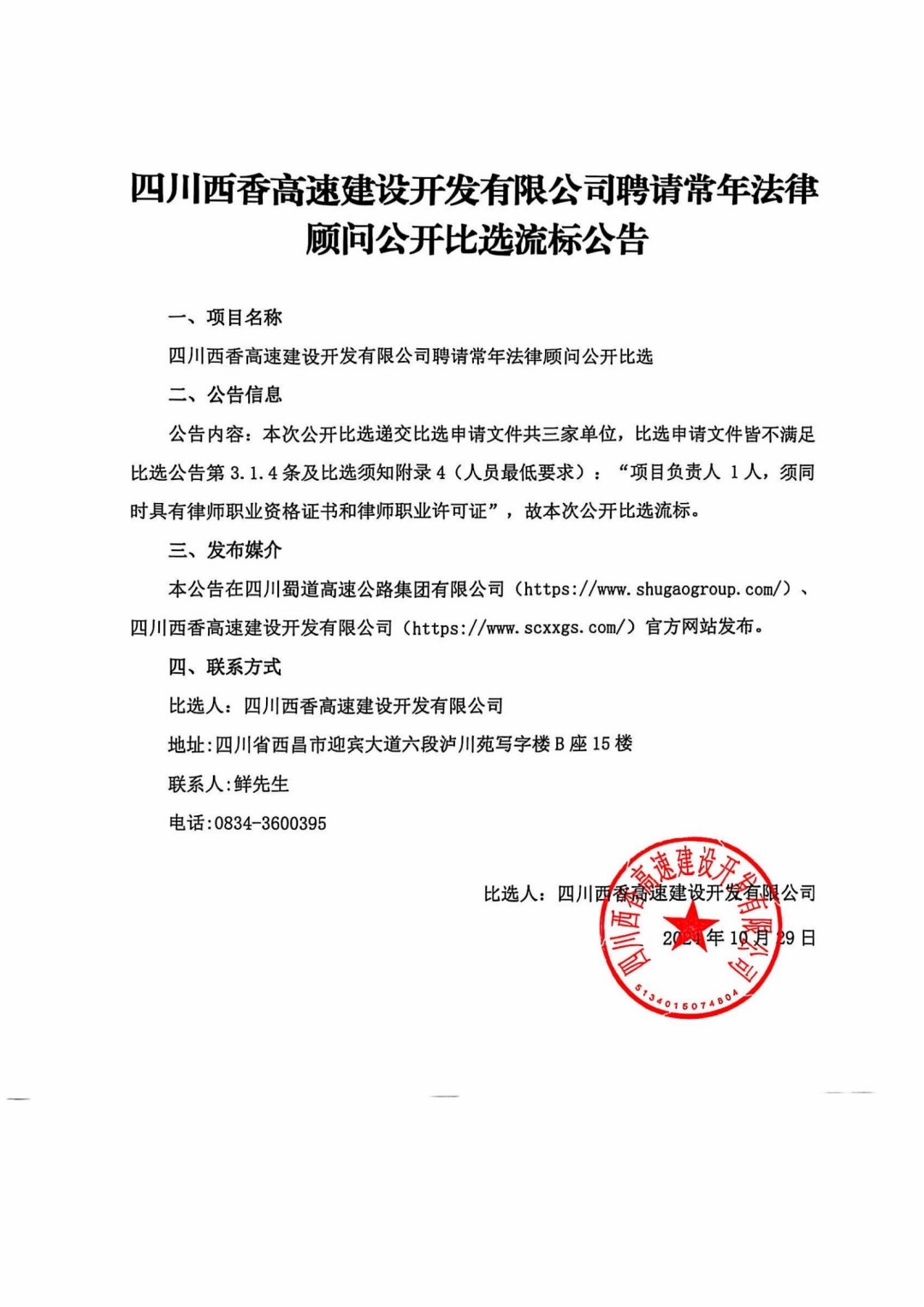 四川西香高速建设开发有限公司聘请常年法律顾问流标公告