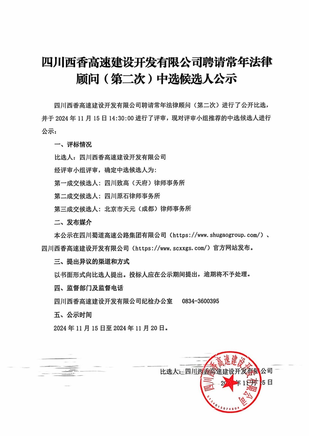 四川西香高速建设开发有限公司聘请常年法律顾问(第二次)中选候选人公示