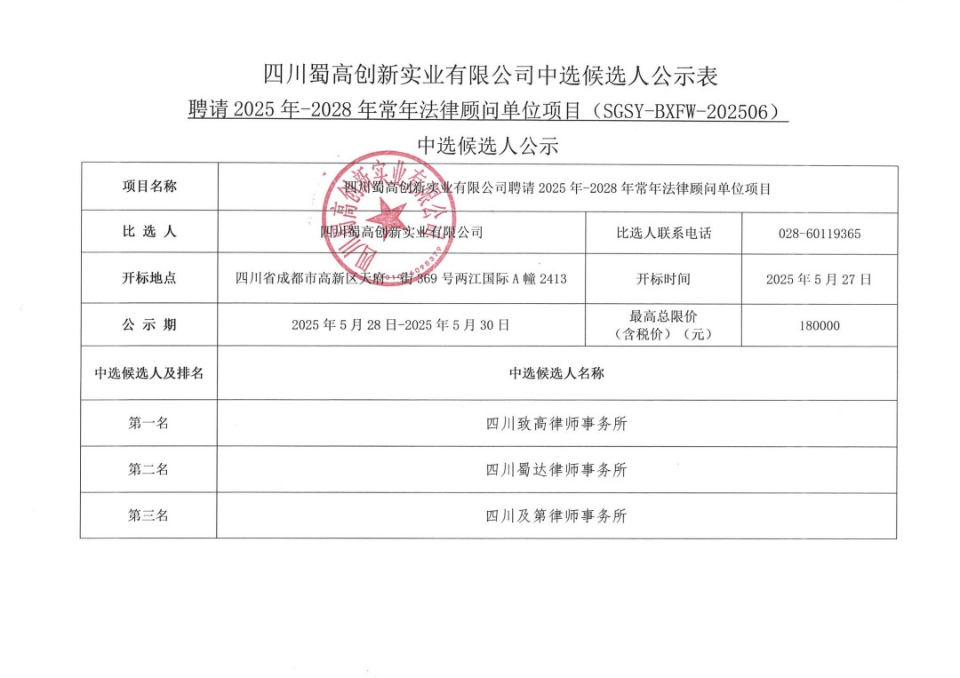 四川蜀高创新实业有限公司聘请2025年-2028年常年法律顾问单位项目中选候选人公示