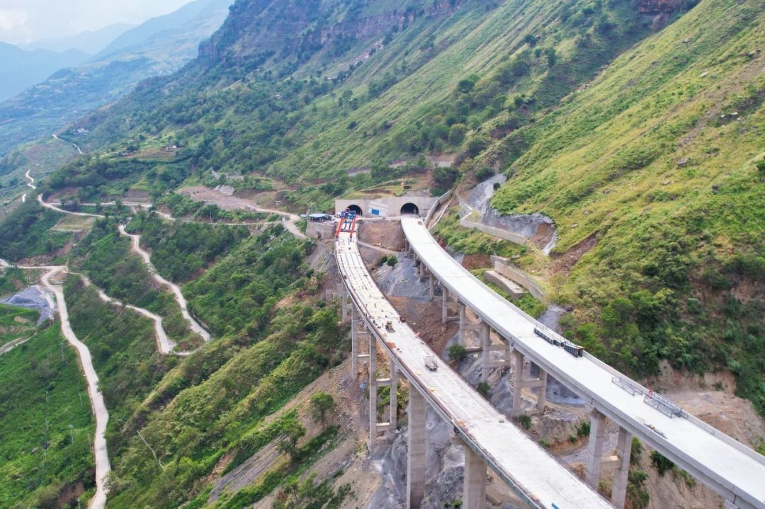 项目地处陡崖山坡上,路线跨越2处冲沟,大桥主墩位于峡谷山脊上,施工难度大,技术要求高。面对前期山体陡峭无工作面情况,项目通过机械破碎和爆破形式开辟施工通道,桩基施工采用6级分层旋挖,确保桩基有效成孔。左线特大桥47-50#墩为35+55m钢板梁,采用梁上曲线顶推施工,施工中项目通过验算分析各点位受力状态,采取强化梁体连接质量、实时监控顶推线形、严控每循环精准定位及动态纠偏等措施,有效解决了现场施工纵坡大、曲线顶推精度高及落梁高度大等难题。
