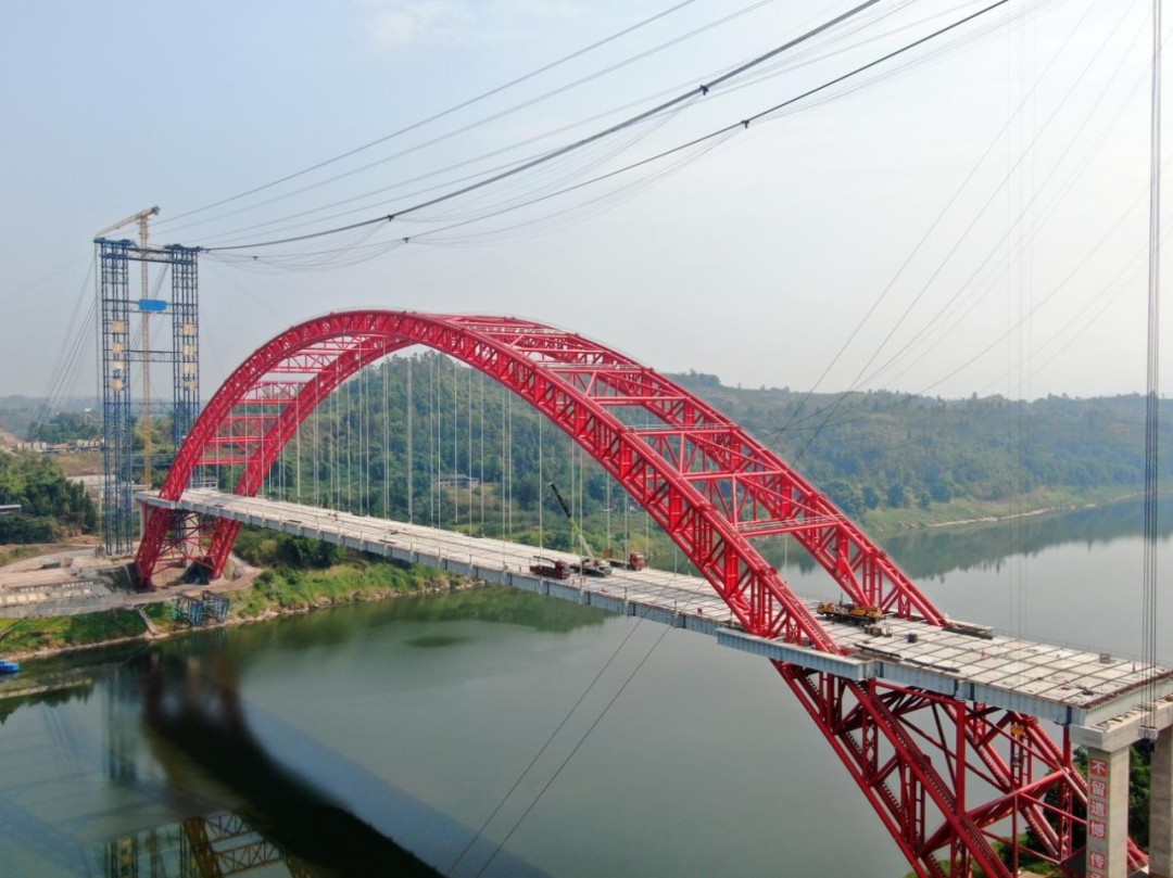 白马渠江特大桥是镇广高速通广段重要的控制性工程,大桥全长657.8米,主跨390米,主桥采用整幅设计,为中承式钢管混凝土拱桥,两岸拱座均采用钢筋混凝土重力式结构,全桥桥面板安装共计472张。大桥主桥主体工程建设历时近1年零1个月,2023年8月1日主拱开始吊装,2024年1月3日主拱合龙,7月24日拱下钢主梁合龙,8月23日全桥钢主梁安装完成,9月23日完成全桥桥面板安装,距首张桥面板安装仅用时25天。