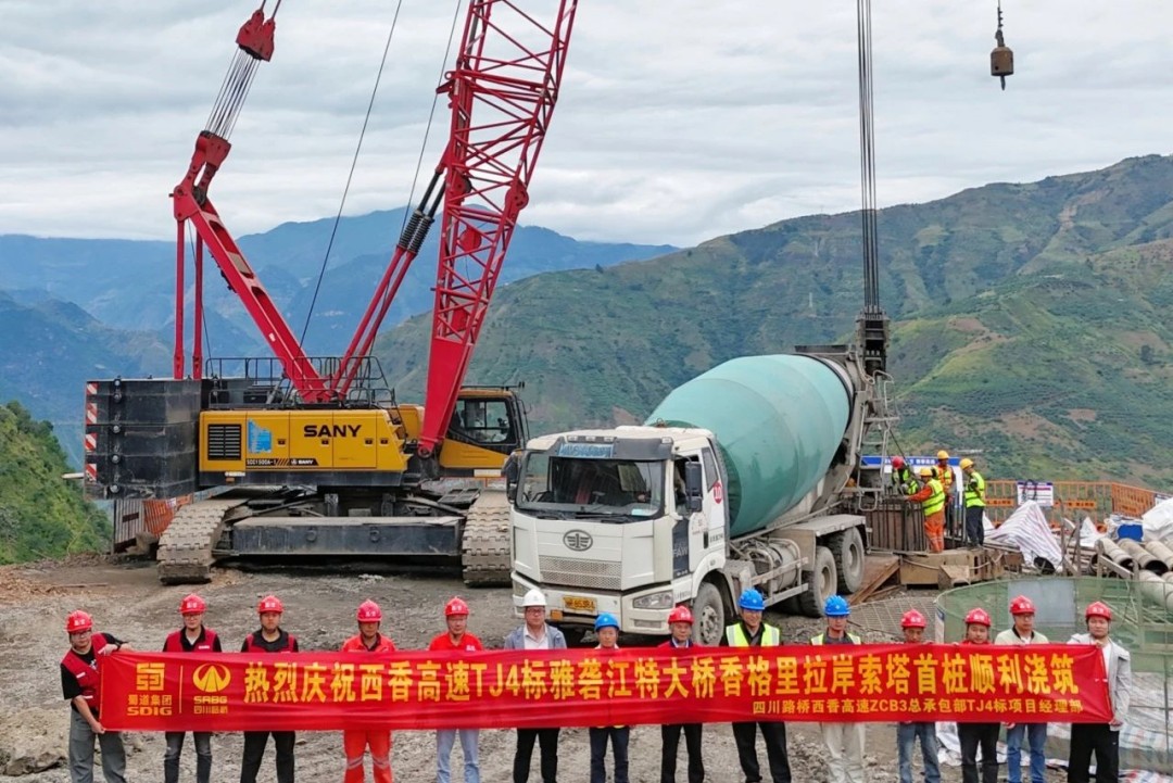 雅砻江特大桥为西香高速“九大超级工程”之一,全桥长1482.5米,主跨跨径1200米,索塔为钢筋混凝土塔,塔高232.7米;香格里拉岸索塔桩基40根,桩径2.8米,最长桩基60米,此桥首次在千米级以上悬索桥主桥上采用高韧性混凝土组合桥面板,属世界首创。