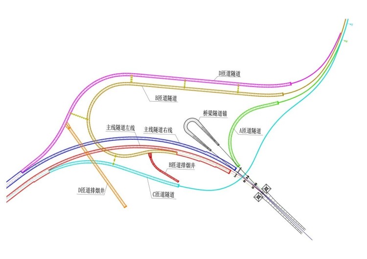 作为西香高速“九大超级工程”之一,元宝枢纽地下互通地处盐源县长柏镇境内,是全国首例高速公路全地下枢纽互通。其左线全长3025米,右线全长3050米,较明线方案可减少绕行6.8公里,最大限度地提升了通行效率,缩短运营里程。受限于复杂的横断山区峡谷地形和地质条件,元宝枢纽地下互通主要为隧道内的地下立交,包含主线元宝特长隧道及4座匝道隧道,其中B、D匝道隧道分别设置排烟井用于火灾情况下排烟通风。