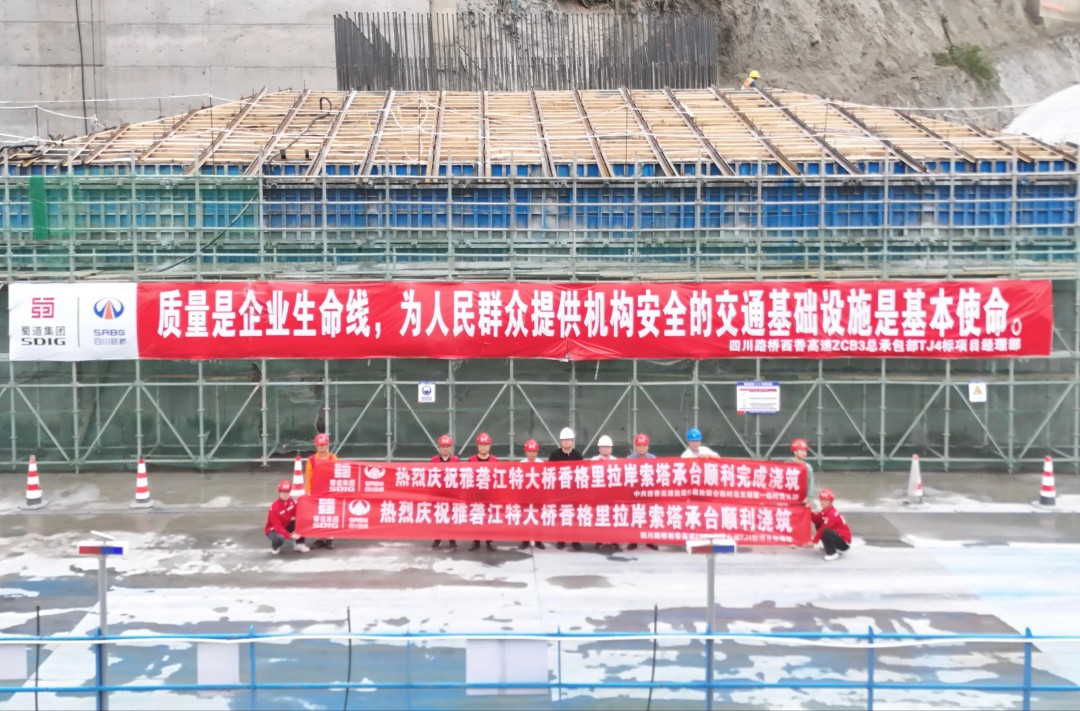 5月31日,西香高速雅砻江特大桥香格里拉岸索塔双幅承台顺利完成浇筑,标志着大桥两岸承台浇筑完成,桥梁建设全面进入索塔施工阶段。