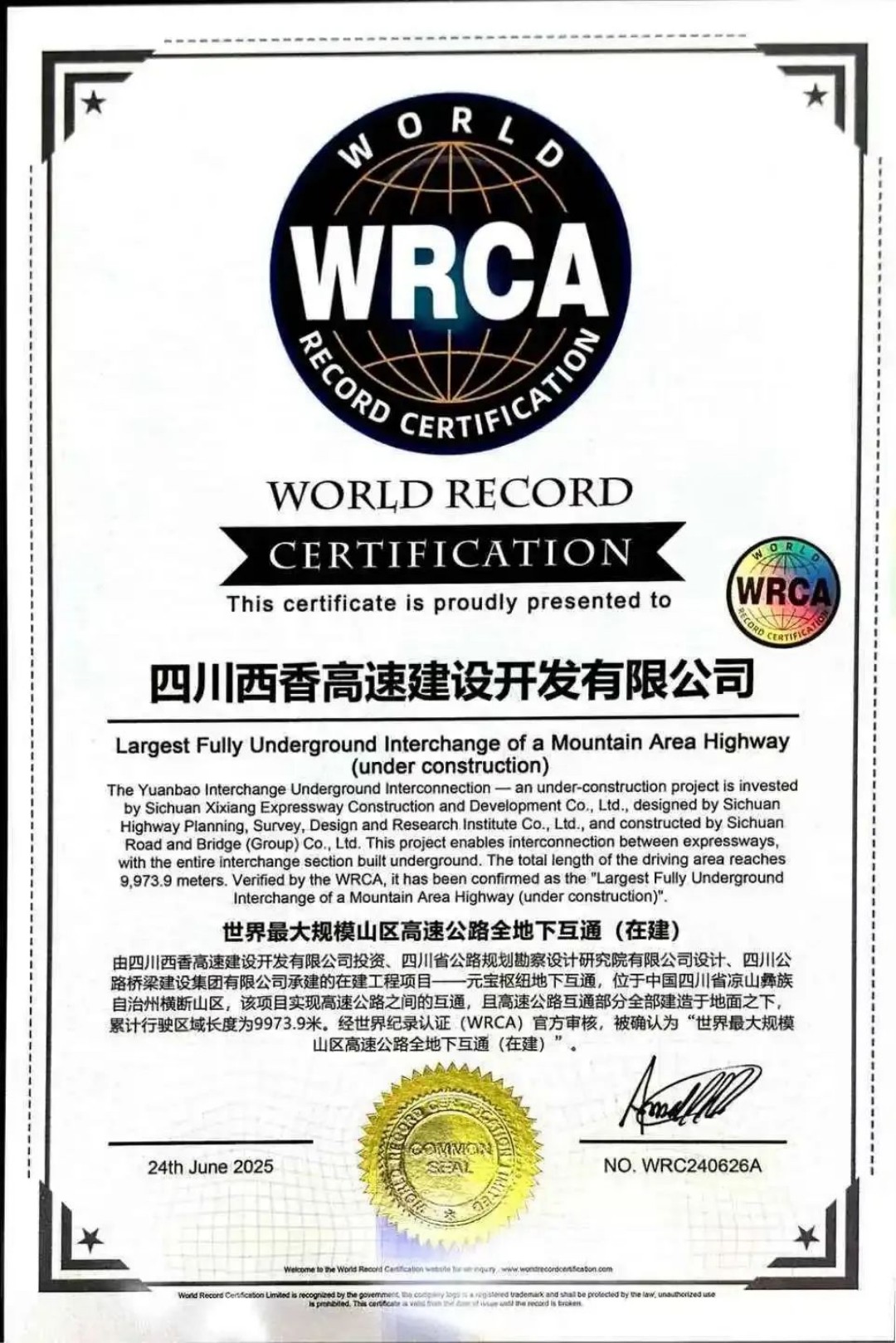 6月24日,世界纪录认证仪式在G7611线西昌至香格里拉(四川境)高速公路(以下简称“西香高速”)TJ11标段举行。西香高速“九大超级工程”之一——元宝枢纽地下互通,被正式认证为“世界最大规模山区高速公路全地下互通枢纽(在建)”。