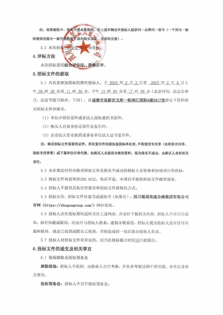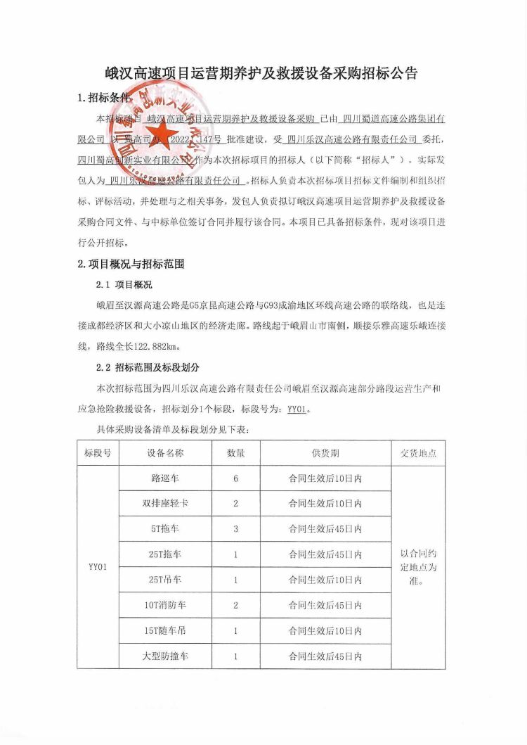 峨汉高速项目运营期养护及救援设备采购招标公告