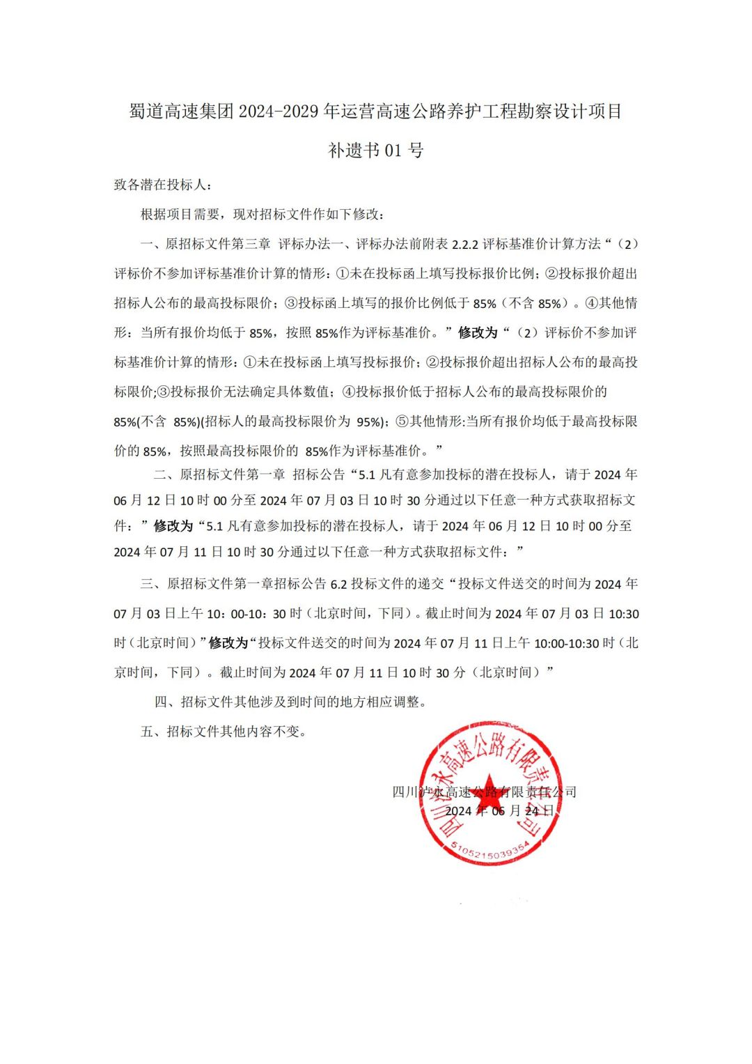 3044am永利集团2024-2029年运营高速公路养护工程勘察设计项目补遗书01号