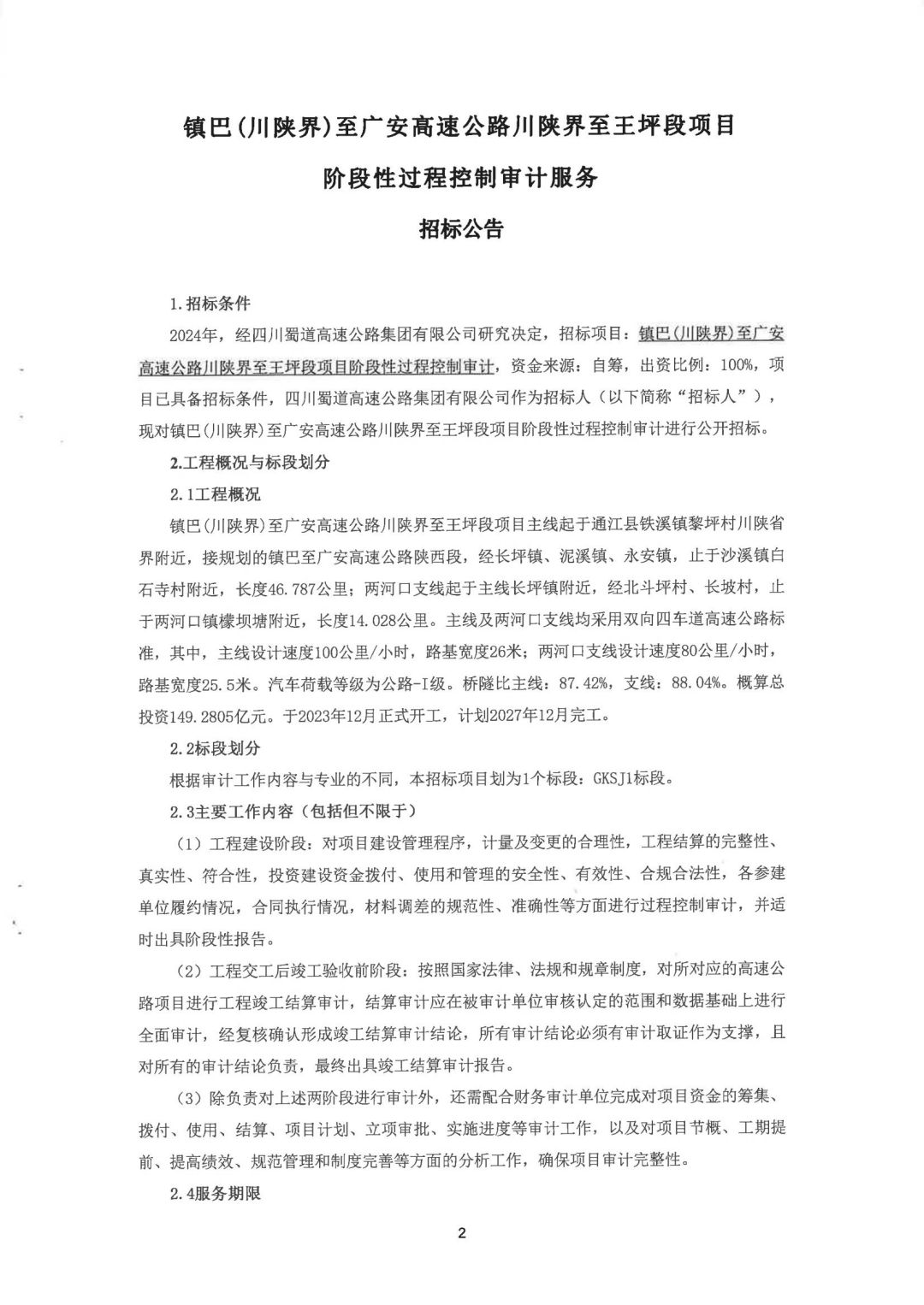 镇巴(川陕界)至广安高速公路川陕界至王坪段项目阶段性过程控制审计服务招标公告